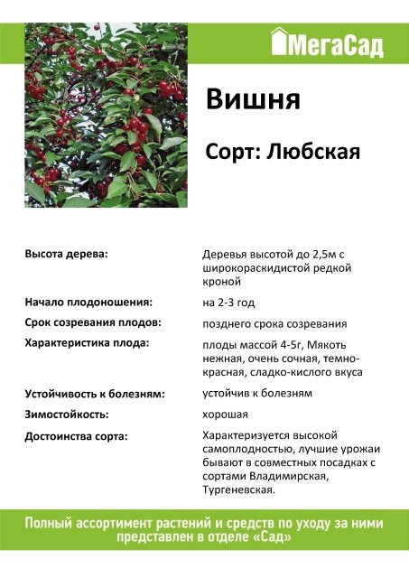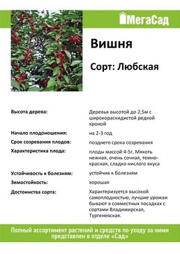 Позднего срока созревания. Дерево небольших размеров, высотой до 2,5 м, с широкораскидистой кроной. Плоды формируются по 1-2, реже по 3-4, от среднего размера до крупных, массой до 4 г и более, округло-тупосердцевидные, темно-красные, со светло-красным или красным соком. Мякоть нежная, очень сочная, темно-красная, сладко-кислого вкуса. Цветение происходит в среднепоздние сроки. Характеризуется высокой самоплодностью, лучшие урожаи бывают в совместных посадках с сортами Владимирская, Жуковская. Растения вступают в плодоношение рано – в 2-3-летнем возрасте после посадки и быстро наращивают продуктивность. Зимостойкость высокая.