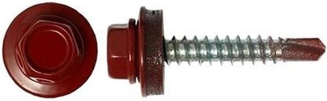 Профессиональный кровельный саморез с окрашенным покрытием цвета темно красный для монтажа кровельных и фасадных материалов.