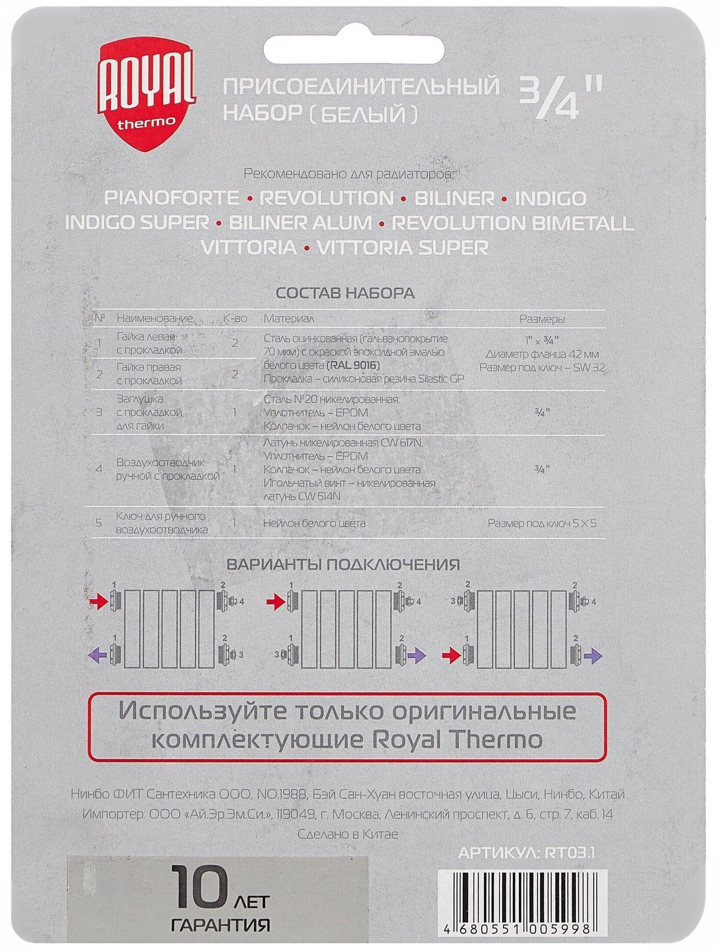 Комплект для подключения радиатора Royal Thermo 1"x3/4" чёрного цвета — идеальное решение для тех, кто ценит качество и стиль. Этот набор включает всё необходимое для быстрого и надёжного монтажа радиатора, обеспечивая долговечность и эффективность работы вашей системы отопления.