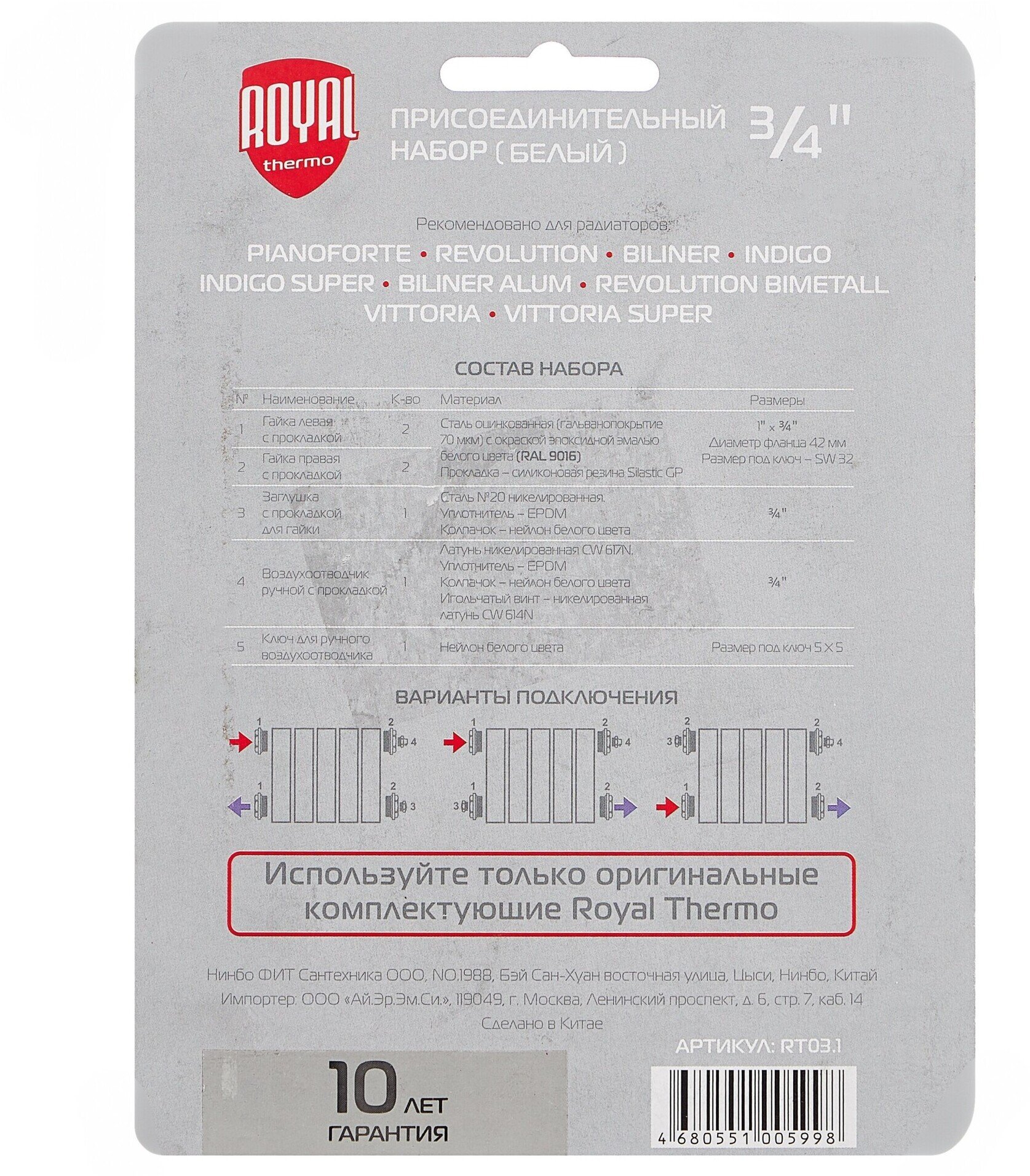 Комплект для подключения радиатора Royal Thermo 1"x3/4" в серебристом цвете — идеальное решение для создания стильной и функциональной системы отопления. Этот набор включает всё необходимое для быстрого и надёжного монтажа радиатора, обеспечивая долговечность и эффективность работы вашей системы.
