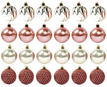 Чтобы декорировать елочку модно и элегантно, подвески на ней должны сочетаться между собой и с убранством комнаты. Важно не просто развесить свой "клад", но и хорошо продумать, где поместить ту или иную деталь. Один из самых простых способов решения этой задачи - выбрать елочные шарики одной цветовой гаммы. В этом вам поможет набор шаров 24 шт в розово-золотых оттенках , которые сделают украшение вашей новогодней елки еще более привлекательным.