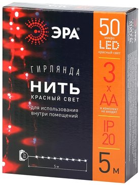 - Электрогирлянда Нить красный свет LED 50 АА 5м ЭРА