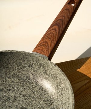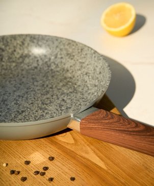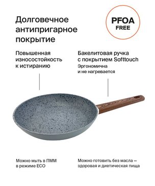 Прочное и долговечное антипригарное покрытие, которое не содержит вредных кислот (PFOA), безопасно для здоровья. Легко моется, позволяет готовить с минимальным количеством масла. Прочное дно и корпус сковороды не подвержены деформации и обеспечивают равномерный нагрев.
