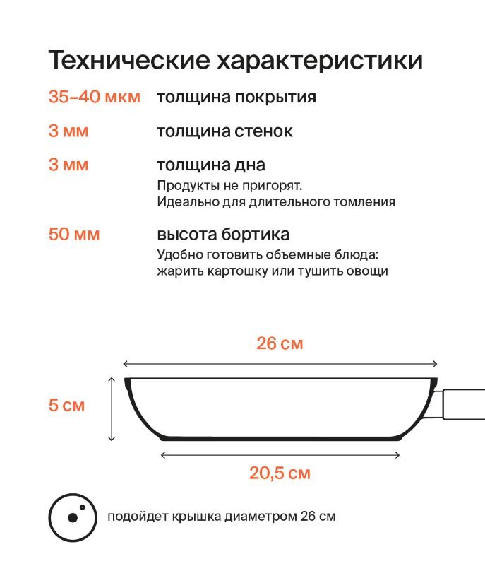 Бакелитовая ручка с мягким напылением. Трехслойное антипригарное усиленное покрытие "Гранит", стандарт Pfluon. Толщина покрытия 35мкр. Трехслойное покрытие Pfluon выдерживает от 6 до 8 тысяч циклов на истирание. Диаметр по верху (крышка): 26см, высота бортика 50мм, толщина дна 3,0мм.
