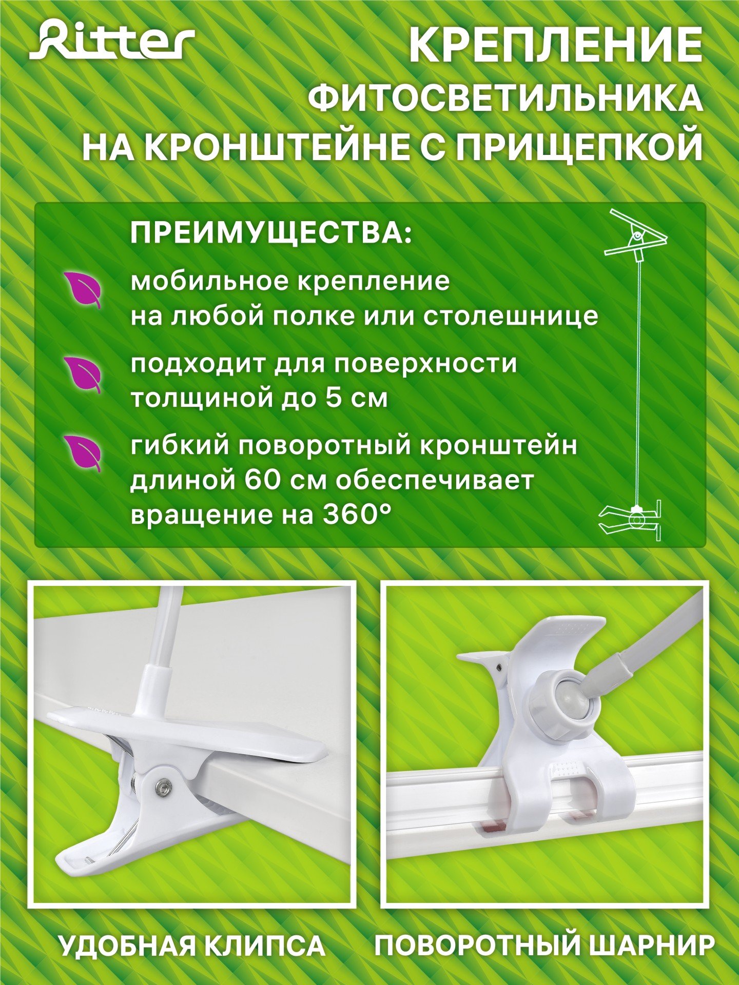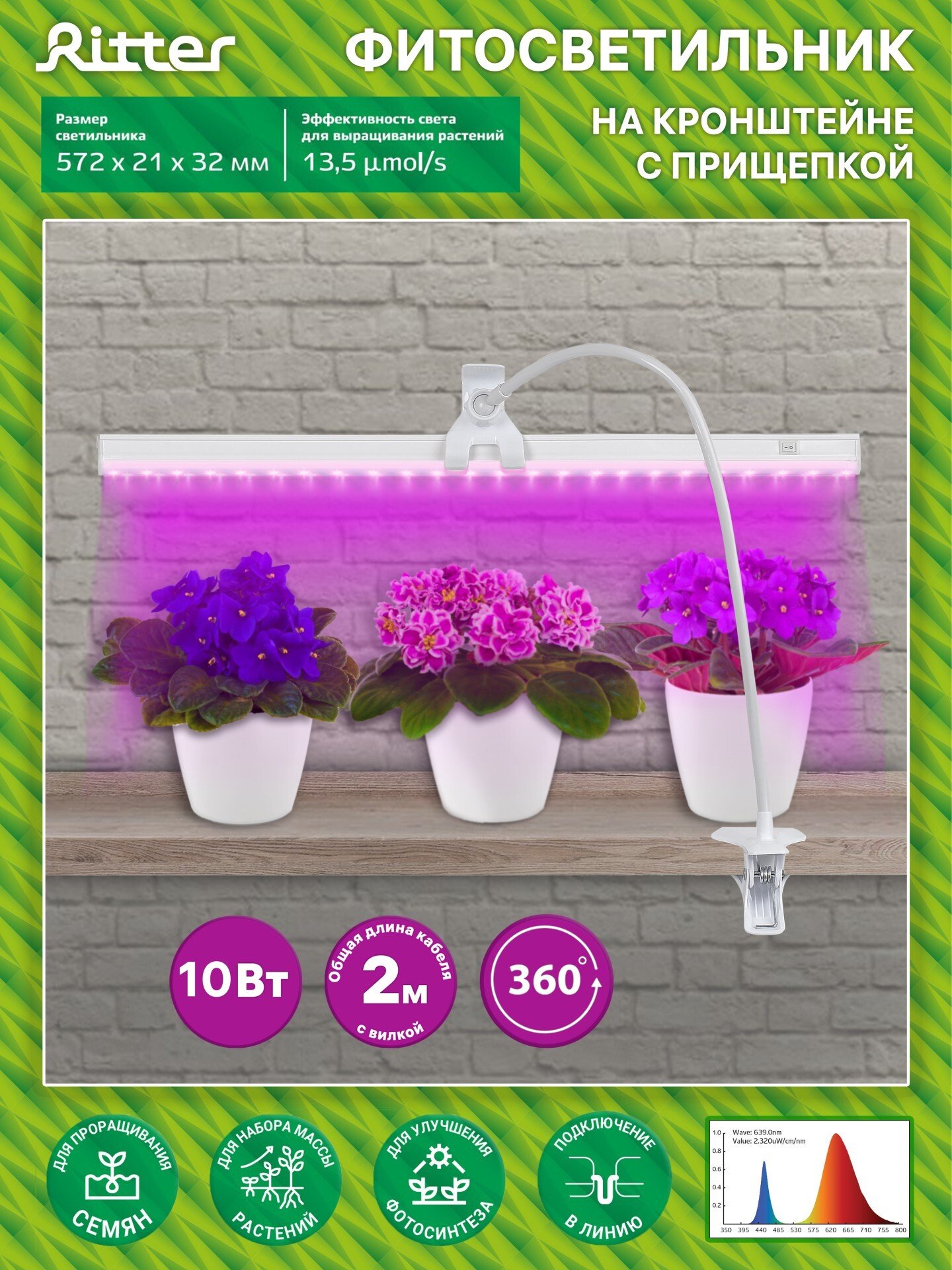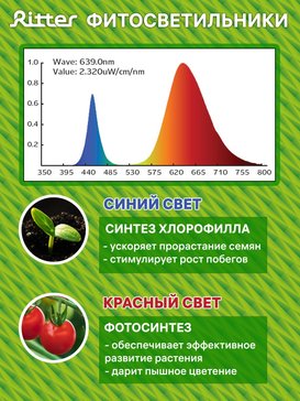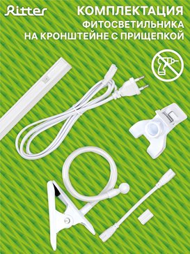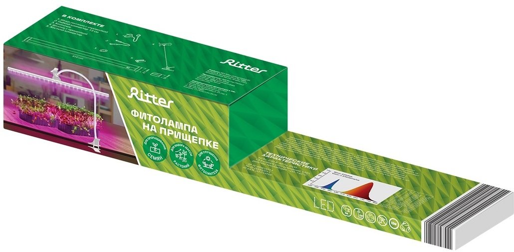 -29%Светильник на кронштейне с прищепкой Ritter с ультрафиолетовым свечением предназначен для ускорения роста и развития растений, рассады и плодов. Красно-синий спектр свечения. Благодаря надёжной прищепке фитолампу удобно использовать для выращивания рассады и комнатных цветов как на подоконике, так и в любом другом удалённом от света месте - на полке, на кухонной столешнице, на стеллаже, на тумбе, на комоде, на столе. Конструкция кронштейна позволяет регулировать угол наклона лампы, максимальная высота 60 см.