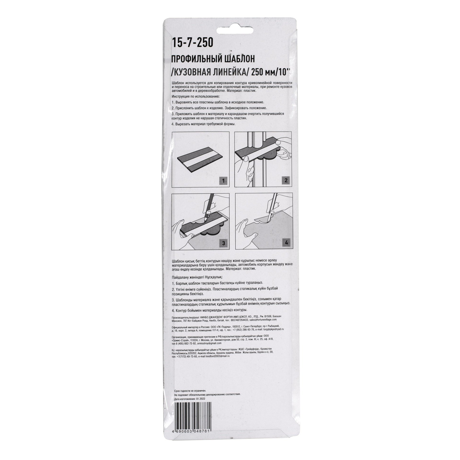 Инструмент состоит из системы параллельных пластиковых пластин, которые свободно перемещаются параллельно друг другу. С помощью профильного шаблона можно быстро и с высокой точностью получить форму профиля детали. Шаблон используется для копирования контура криволинейной поверхности и переноса на строительные или отделочные материалы, используется при ремонте кузовов автомобилей и в деревообработке.