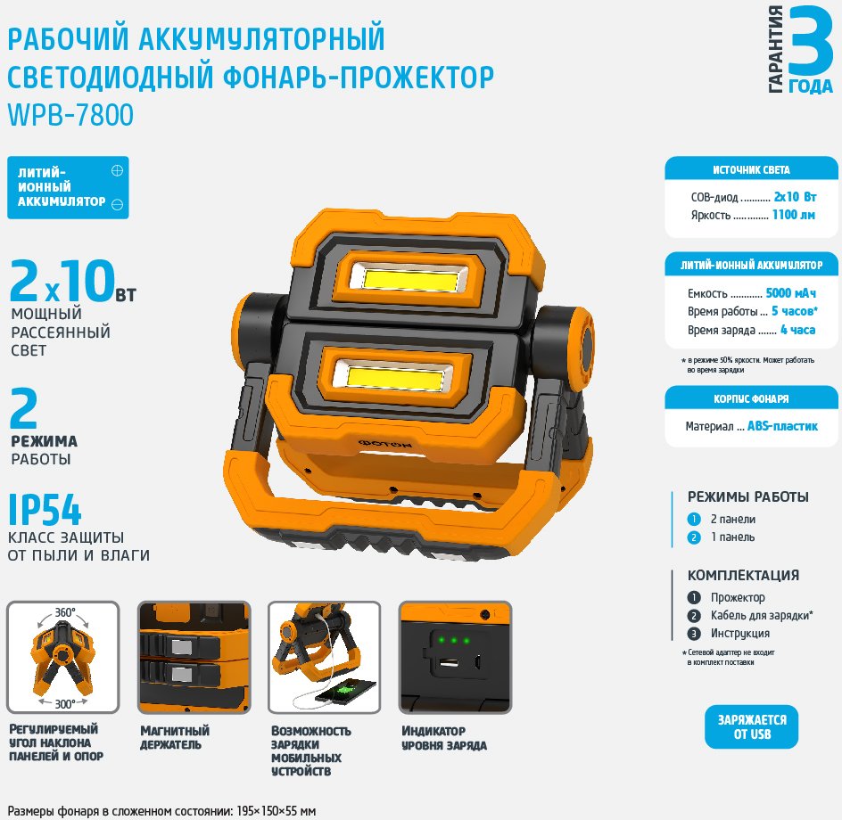 - Прожектор светодиодный аккумуляторный ФОТОН WPВ-7800 20W IP54