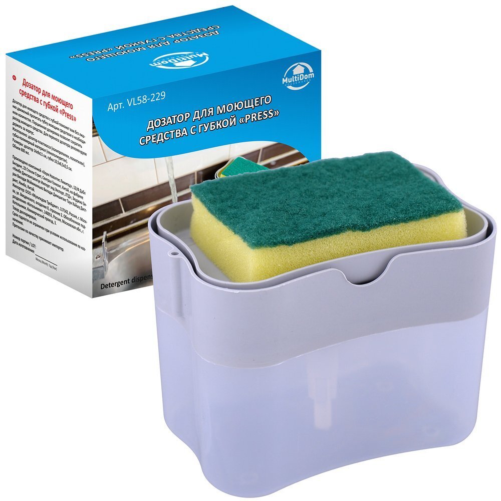 - Дозатор д/моющего средства с губкой Multidom Press 600мл 14х9х11см пластик