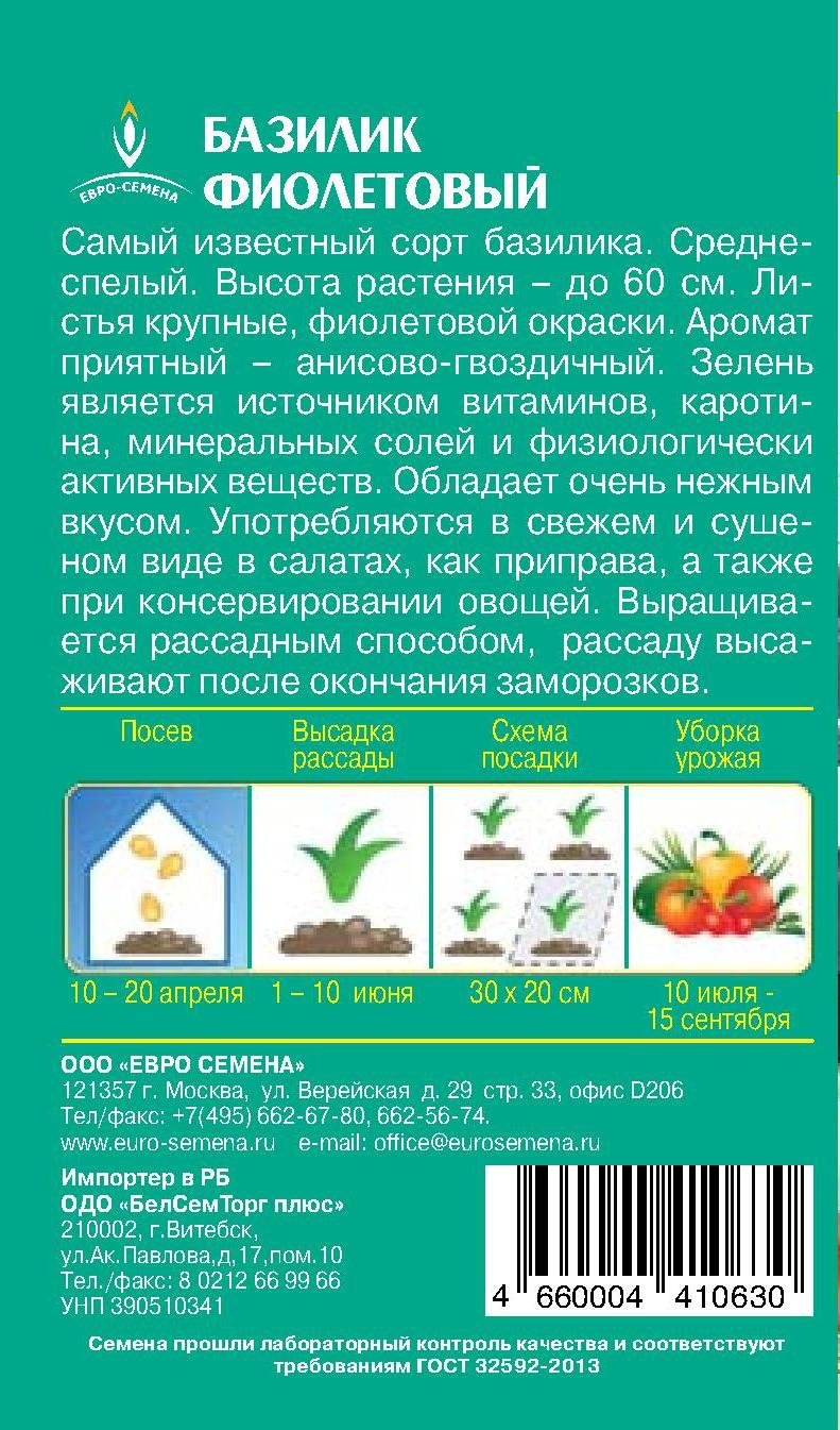 -36%Самый известный сорт базилика. Среднеспелый. Высота растения – до 60 см. Листья крупные, фиолетовой окраски. Аромат приятный - анисово-гвоздичный. Зелень является источником витаминов, каротина, минеральных солей и физиологически активных веществ. Обладает очень нежным вкусом. Употребляются в свежем и сушеном виде в салатах, как приправа, а также при консервировании овощей. Выращивается рассадным способом, рассаду высаживают после окончания заморозков.