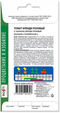 -36%Откройте для себя уникальный сорт томатов «Бренди розовый»! Невероятный вкус, крупный размер – 250-500 г. Среднеспелый сорт для пленочных теплиц. Период от всходов до созревания 115-120 дней. Растение высокорослое, требует формирования и подвязки. Лист картофельного типа. Плоды плоскоокруглые, ребристые, розового цвета. Для употребления в свежем виде и приготовления соусов.