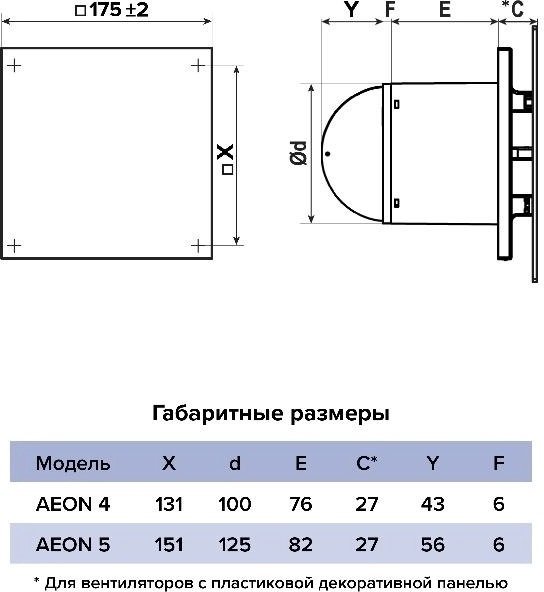 Декоративная панель из глянцевого стекла подходит для всех моделей вентиляторов AEON. Стильная декоративная накладная панель позволяет интегрировать AEON в любой интерьер и обновлять его при желании, выбирая цвет панели из разнообразия вариантов. Для установки декоративной панели необходимо повернуть ее на 45°, затем прижать к лицевой панели вентилятора и еще раз повернуть на 45° по часовой стрелке. Таким образом декоративная панель будет надежно зафиксирована. В случае установки вентилятора в потолок необходимо закрепить лицевую панель снизу на корпусе саморезом (входит в комплект).