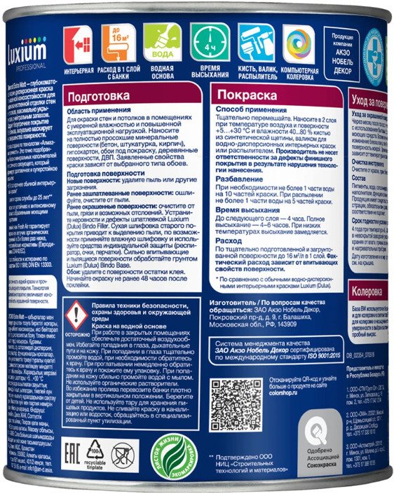 -10%• В 10 раз прочнее, чем обычные интерьерные краски* • Гарантия срока службы до 25 лет** • Выдерживает многократное мытье с абразивными моющими средствами • Экологичная и безопасная Описание: Глубокоматовая водно-дисперсионная краска повышенной износостойкости для высококачественной отделки стен и потолков, максимально укрывистая, с нейтральным запахом. Создает безупречное покрытие без бликов, визуально маскирует несовершенства поверхности. В основе «Алмазной прочности» — точно подобранный баланс минеральных наполнителей и эластичного связующего, который формирует долговечное и суперстойкое покрытие. Краска легко наносится, не образует потеков. Область применения: Для окраски стен и потолков в помещениях с умеренной влажностью и повышенной эксплуатационной нагрузкой. Наносите на полностью просохшие минеральные поверхности (бетон, штукатурка, кирпич), гипсокартон, обои под покраску, деревянные поверхности, ДВП. Заявленные свойства краски зависят от выбранного типа обоев. Рекомендована для применения в детских и лечебно-профилактических учреждениях. Особенности применения: Перед применением тщательно перемешайте. Для укрепления базовой поверхности, повышения адгезии и уменьшения расхода краски загрунтуйте подготовленную поверхность грунтовкой Dulux. Краску рекомендуется наносить в 2 слоя при температуре воздуха и поверхности +5…+30 °С и влажности воздуха от 40 до 80%. Разбавление: При необходимости не более 1 части воды на 10 частей краски.