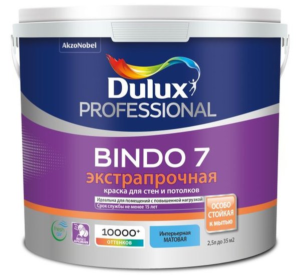 -11%Описание: Экстрапрочная матовая водно-дисперсионная краска для высококачественной отделки стен и потолков в помещениях с высокой эксплуатационной нагрузкой, таких как гостиные, коридоры, офисы, детские сады, школы, медицинские учреждения и др. Тиксотропная: наносится без брызг и потеков, легко разравнивается; с нейтральным запахом. Область применения: Для окраски стен и потолков в помещениях с умеренной влажностью и повышенной эксплуатационной нагрузкой. Наносите на полностью просохшие минеральные поверхности (бетон, штукатурка, кирпич и т.п.), гипсокартон, обои под покраску, деревянные поверхности, ДВП. Заявленные свойства краски зависят от выбранного типа обоев. Рекомендована для применения в детских и лечебно-профилактических учреждениях. Особенности применения: Перед применением тщательно перемешайте. Для укрепления базовой поверхности, повышения адгезии и уменьшения расхода краски загрунтуйте подготовленную поверхность грунтовкой Dulux Bindo Base. Краску рекомендуется наносить в 2 слоя при температуре воздуха и поверхности +5…+30 °С и влажности воздуха от 40 до 80%. Разбавление: При необходимости не более 1 части воды на 10 частей краски.
