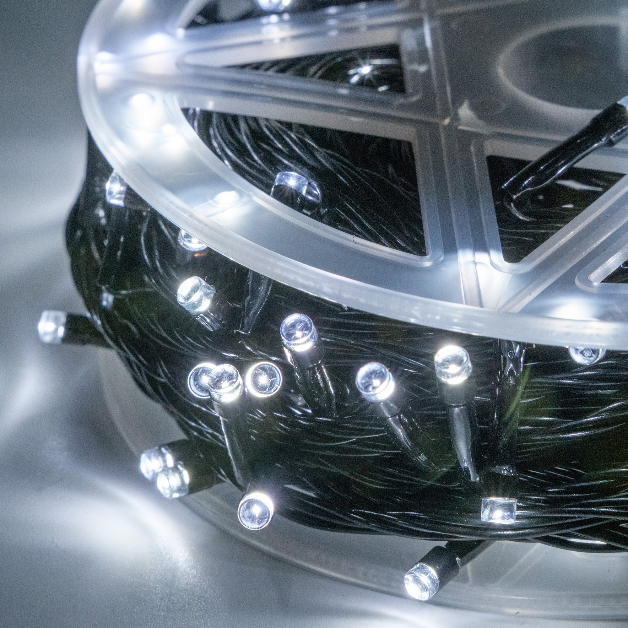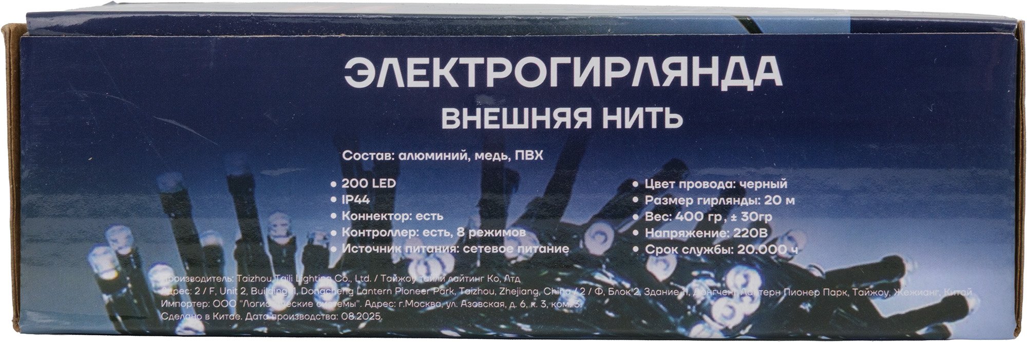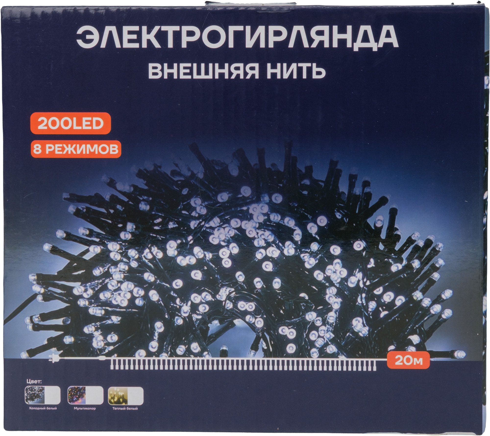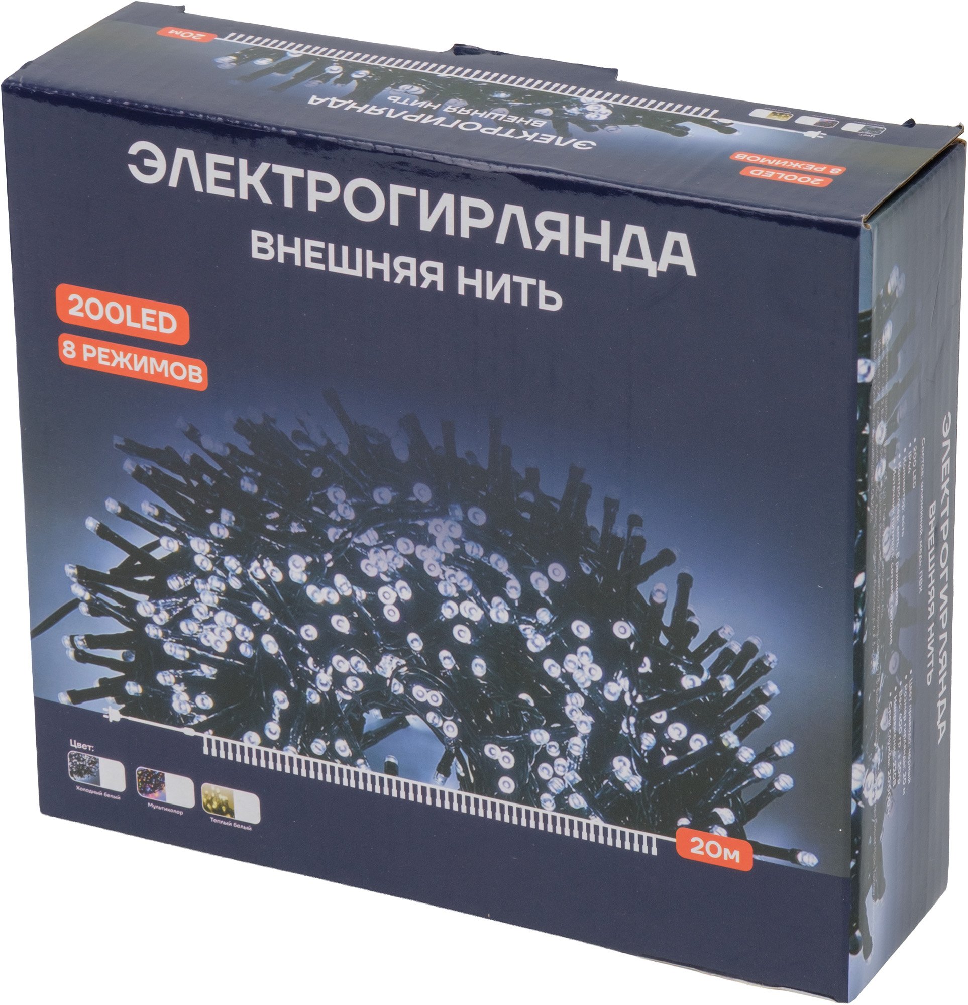 - Электрогирлянда внешняя Нить 20м 200LED IP44, холодный белый, 8 режимов, с коннектором, черный кабель