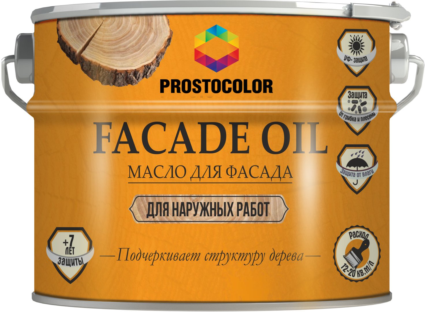 Используется как финишное покрытие. Предназначено для наружных работ (за исключением бесцветного масла, оно используется, как база под колеровку). Идеально подходит для всех типов деревянных строений (дома, бани, бытовки, заборы, беседки) и пород древесины (включая твердые породы и термодревесину). Легко наносится. Подчеркивает структуру древесины. Глубоко проникает в поры, не образовывая пленку, что позволяет древесине дышать. Защищает древесину от влаги и растрескивания. Масло для фасада PROSTOCOLOR прошло испытание в климатических камерах, и показало наилучший результат благодаря сбалансированной формуле, и высокому качеству используемых компонентов. Продукт готов к применению. Подготовка поверхности
