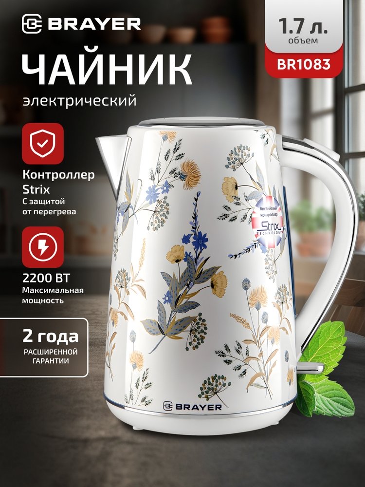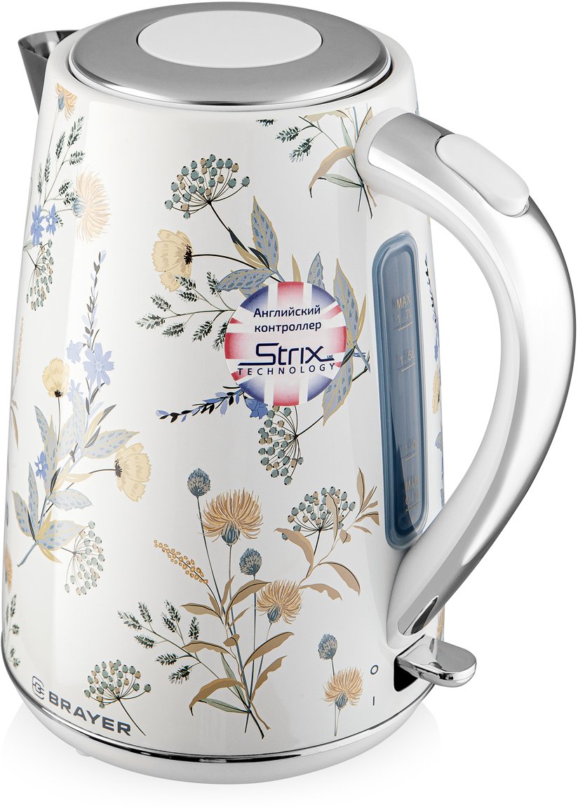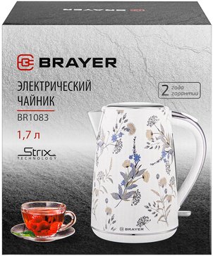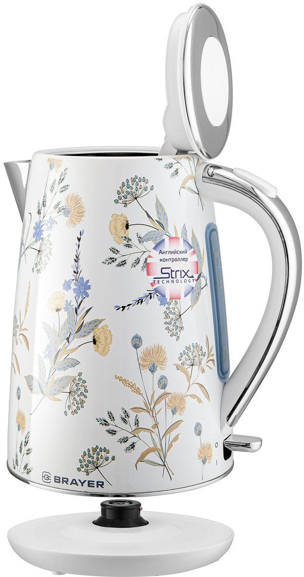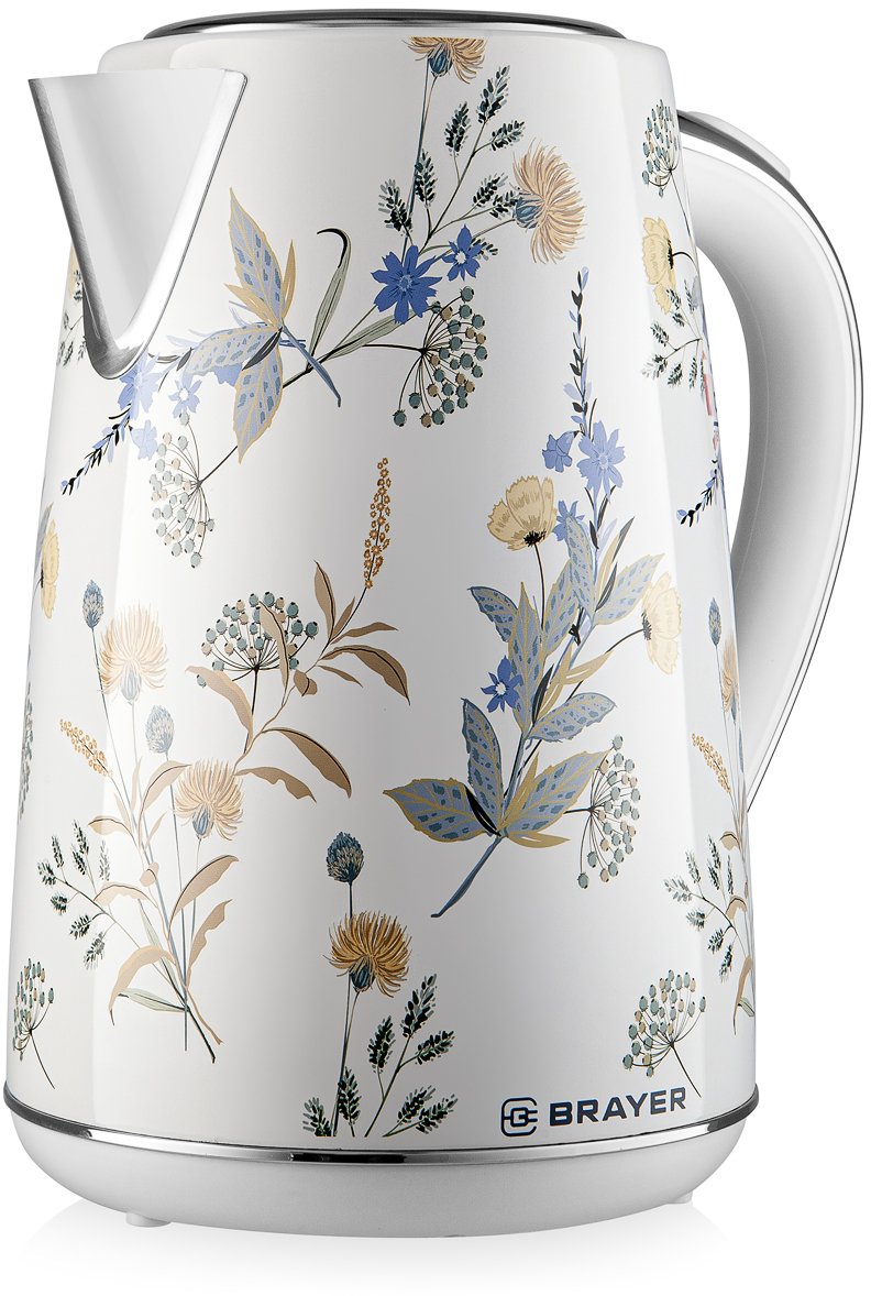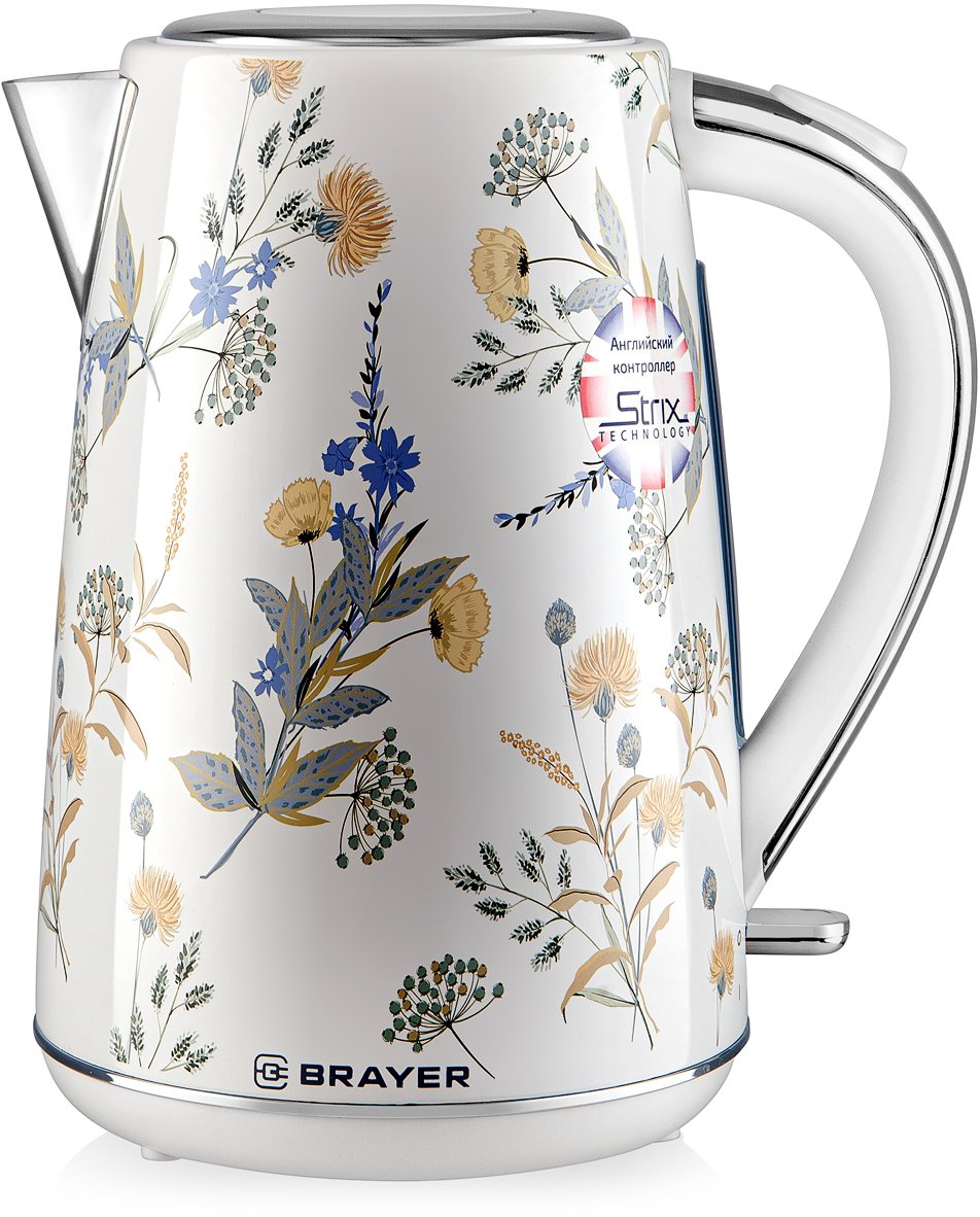 - Чайник электрический Brayer 1083BR 2200Вт 1,7л нерж.сталь, белый с принтом