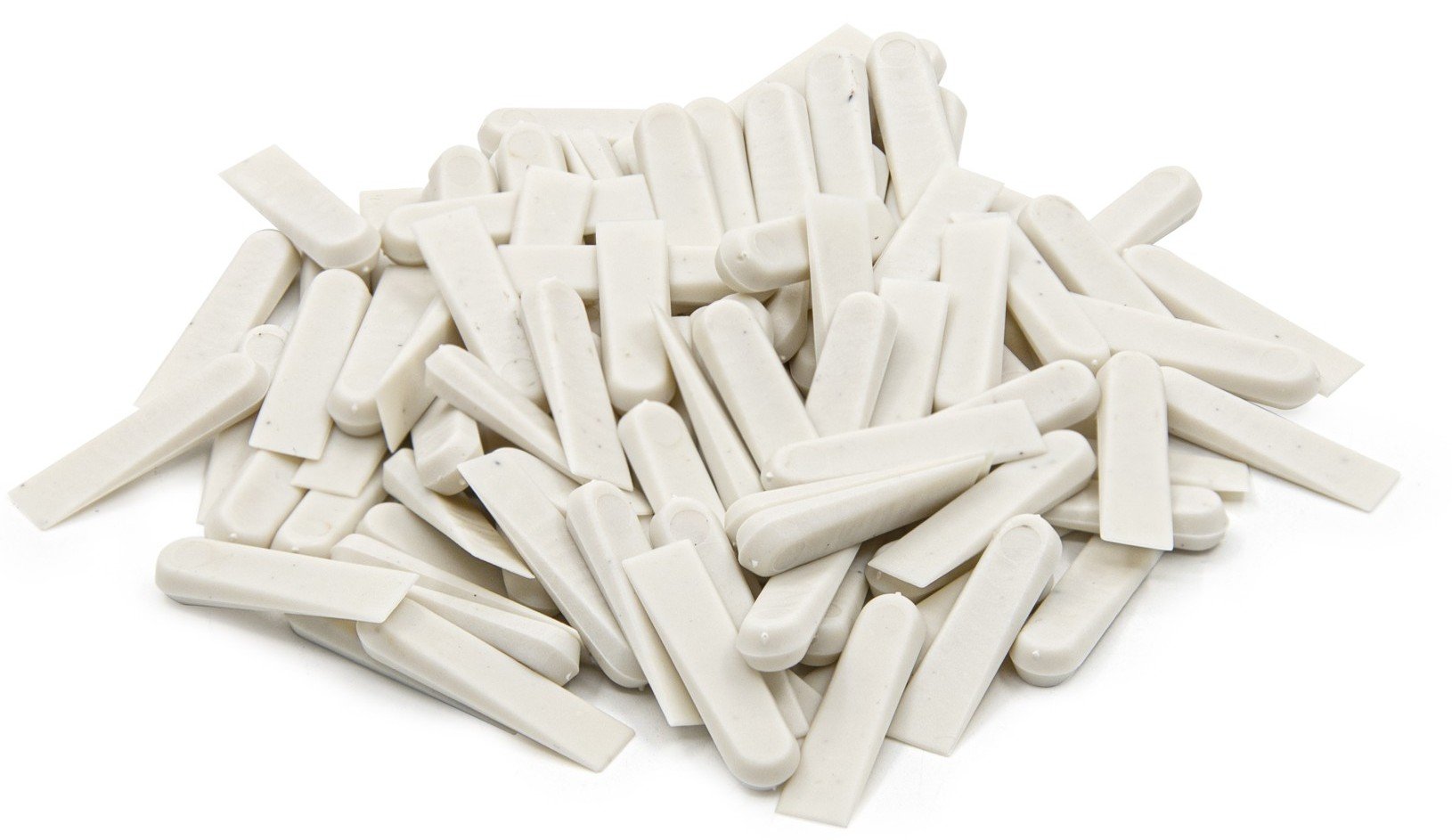 Материал: ПНД (полиэтилен низкого давления). Предназначены для выравнивания керамической плитки относительно поверхности и обеспечения одинаковой ширины межплиточных швов. Их использование особенно эффективно при неровных стенах и больших перепадах в укладочных швах. Размер клиньев выбирается в зависимости от типа отделочных работ, от тяжести и габаритов плиточных материалов. После полного высыхания раствора клинья вынимают, а швы замазывают специальной затиркой.