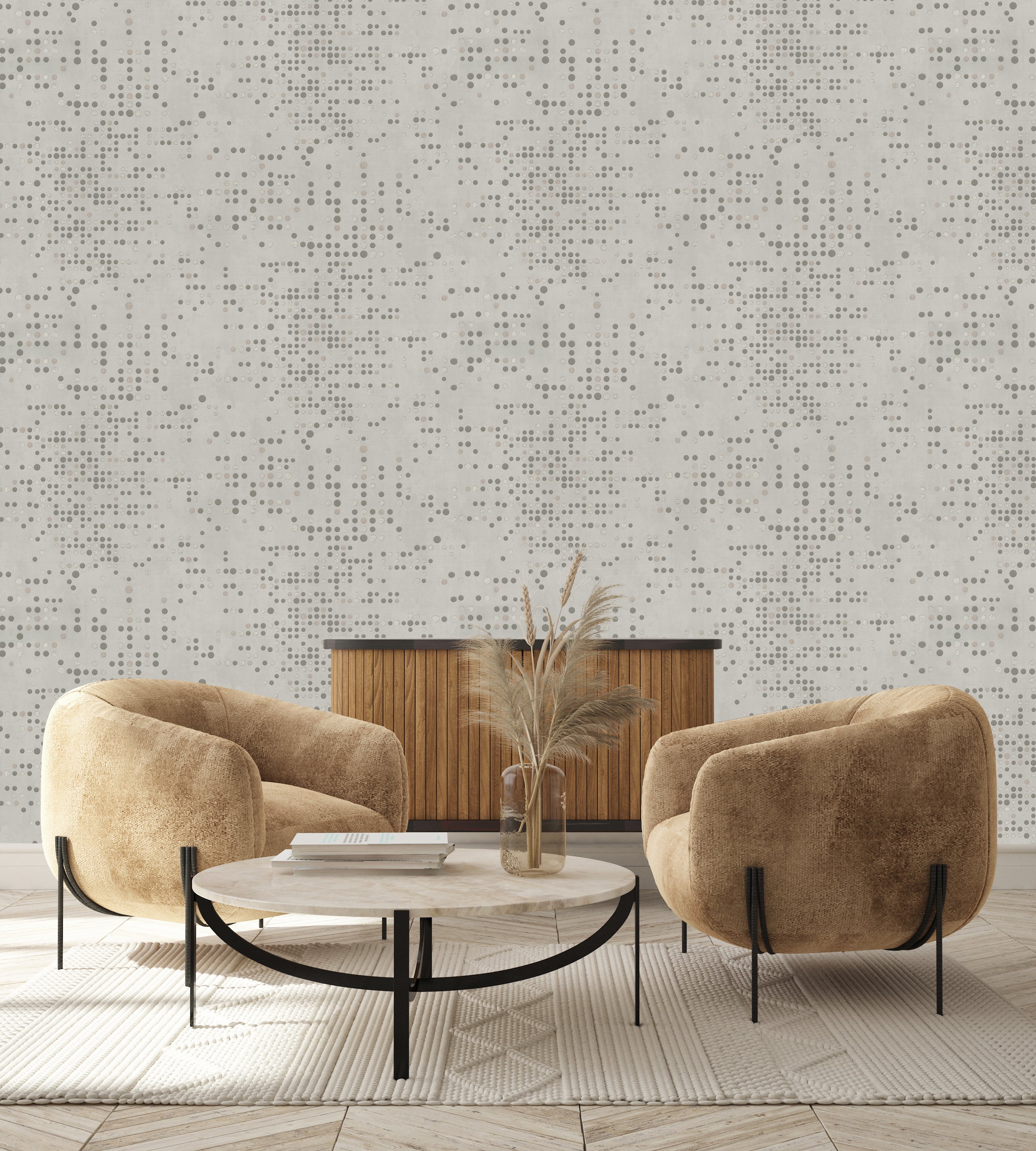 Коллекция обоев «Dotera» представляет собой современное переосмысление минимализма, вдохновленное цифровыми технологиями и футуризмом. Название коллекции отсылает к английскому слову dots — «точки», и этот выбор не случаен — на матовом фоне полотен ярко проступает динамичный орнамент в виде кружков разного размера. Эти «точки» расставлены не в хаотичном порядке — наоборот, они выстраиваются в ритмичный узор, который напоминает цифровой код или пиксели, превращая стены в ожившую абстрактную картину