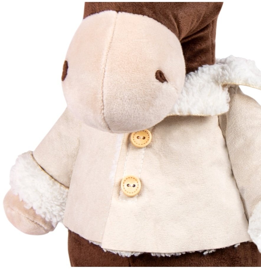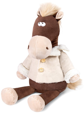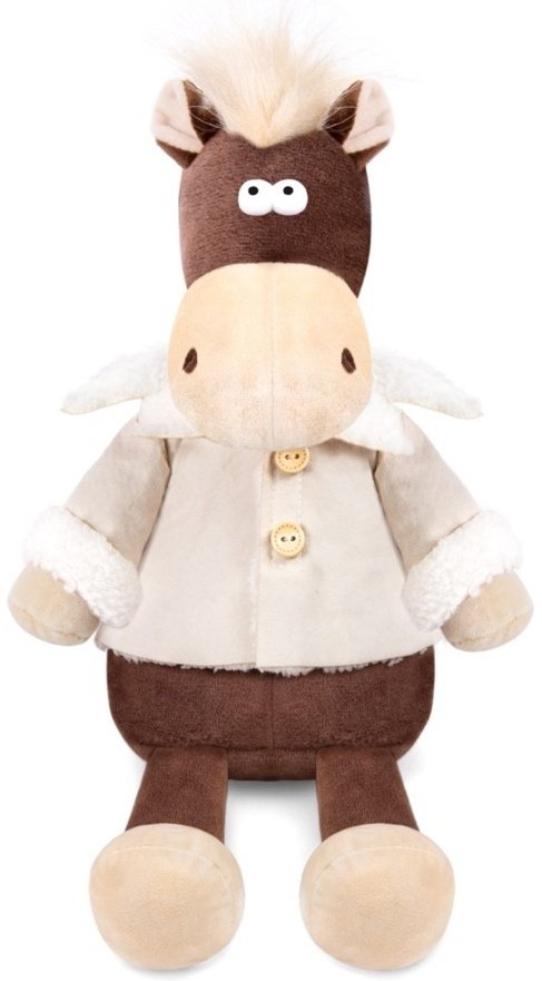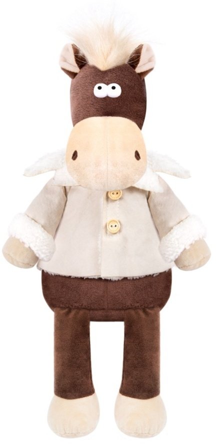 Главное, что бросается в глаза, — стильная дублёнка, которая придаёт коню особенный, чуть «очеловеченный» облик: кажется, будто он только что вернулся с прохладной прогулки и готов устроиться рядом для уютного отдыха. Детали — мягкие ушки, выразительные глаза и лёгкая доброжелательная мимика — оживляют образ, делая его не просто игрушкой, а персонажем со своим характером.