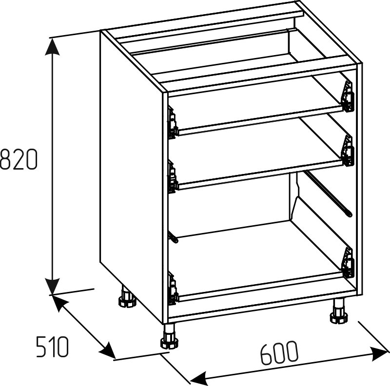 - шкафчик комплектуется: петлями для фасада с доводчиком, направляющими полного выдвижения с доводчиком, регулируемыми опорами высотой 100мм, клипсами для кухонной опоры под пластиковый цоколь, фурнитурой для сборки и инструкцией.