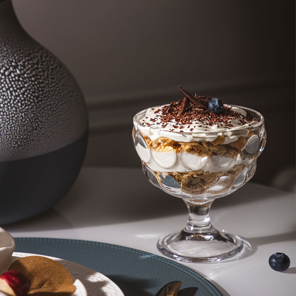 Представьте десертное меню, где каждый десерт подаётся в прозрачной креманке с рельефным узором в виде пузырьков. Игра света на гранях стекла превращает обычную подачу в миниатюрное представление, а каждый кусочек торта или порция мороженого становится по‑настоящему особенным угощением.