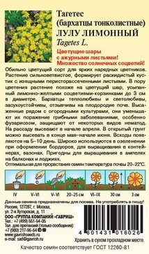- Семена Бархатцы тонколистные Лулу лимонный (Тагетес) 0,05г