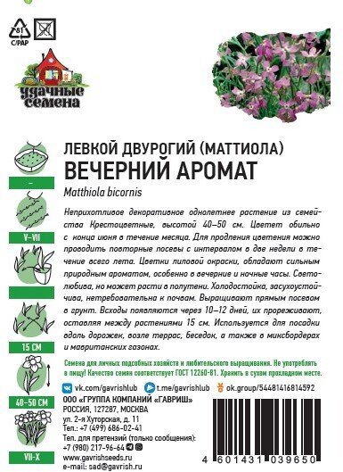 - Семена Левкой двурогий (Маттиола) Вечерний аромат 0,3г