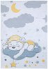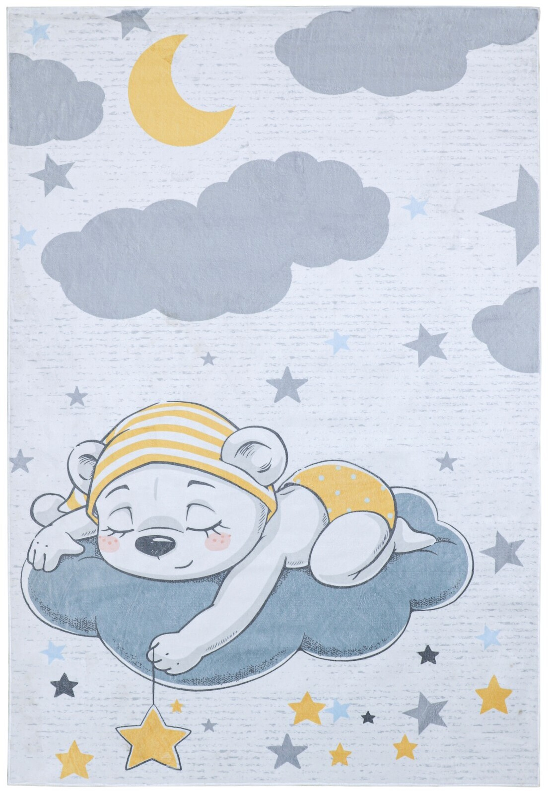 Ковёр RIO 23KD-001 размером 1,2 × 1,8 м — детский прямоугольный ковёр с милым рисунком: спящий медвежонок в полосатой шапочке лежит на облаке, окружённый звёздами, луной и серыми облаками; выполнен в нежных пастельных тонах (жёлтые, серые, голубые оттенки), создаёт уютную атмосферу, идеально подойдёт для детской комнаты, изготовлен из гипоаллергенного полипропилена с ворсом высотой около 10 мм.