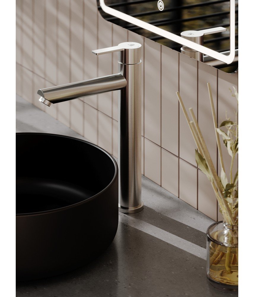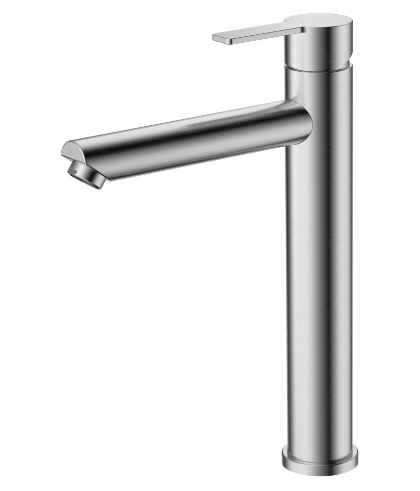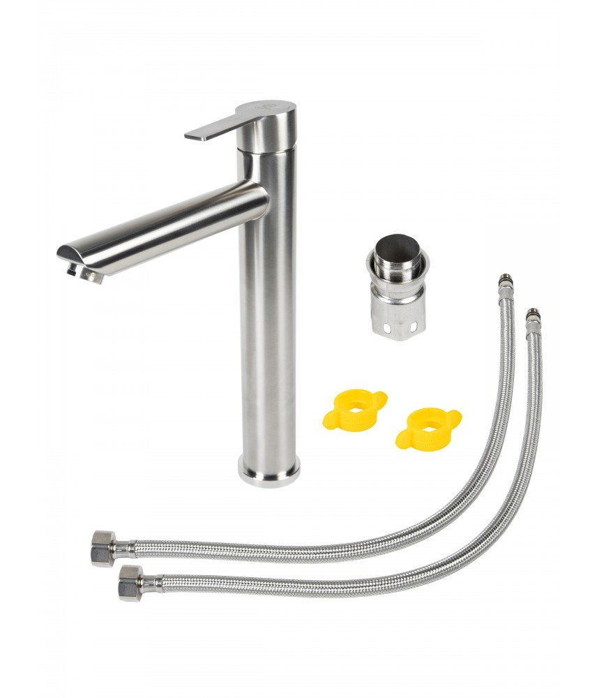 Однозахватный высокий смеситель для накладной раковины Agger Easy с фиксированным изливом гармонично дополнит интерьер ванной комнаты в современном или традиционном стиле. Фирменный керамический картридж Agger и эргономичный рычаг делают легким управление напором и температурой воды. Корпус изделия изготовлен из высококачественной нержавеющей стали, не подверженной коррозии от длительного контакта с водой. Износостойкое покрытие в цвете матовый сатин, за которым очень просто ухаживать мягкой салфеткой, нанесено методом вакуумного напыления. Встроенный аэратор экономит воду и, обогащая струю воздухом, делает ее мягкой без брызг. Гибкая подводка 50 см.