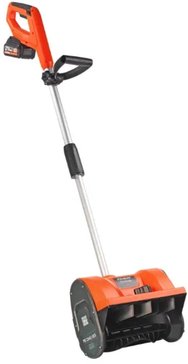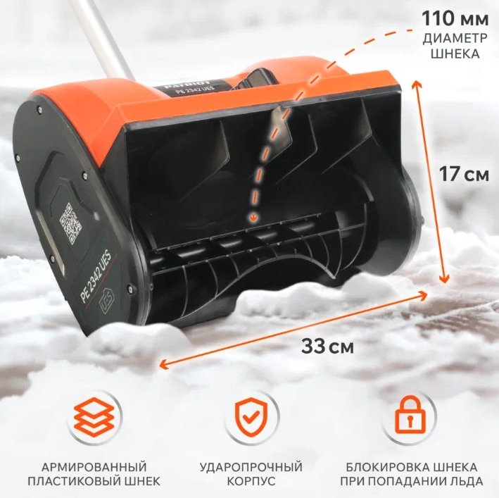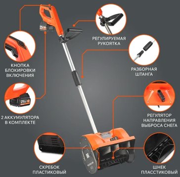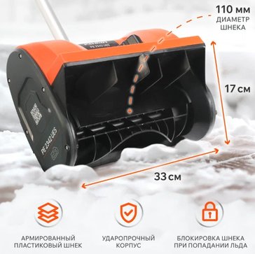 Одноступенчатый шнек (диаметр 11 см) из армированного пластика и удобный ковш (ширина 33 см). Корпус из ударопрочного ABS-пластика. Работа от литий-ионного аккумулятора единой аккумуляторной платформы UES до 20 минут. Время зарядки аккумулятора до 2 часов. Небольшие габариты и складная рукоять упрощают хранение.