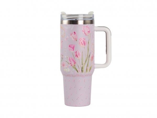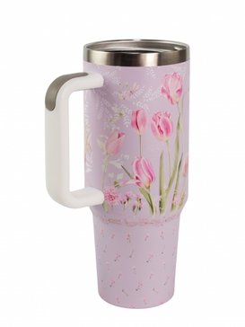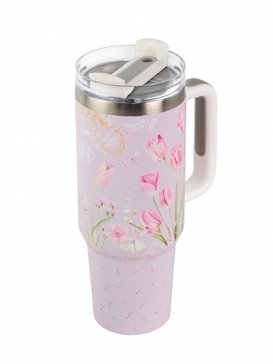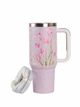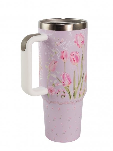 Дизайн термокружки выполнен в приятных зеленых и розовых тонах, что придает ей эстетический вид и делает ее отличным подарком для любителей природы и тюльпанов.